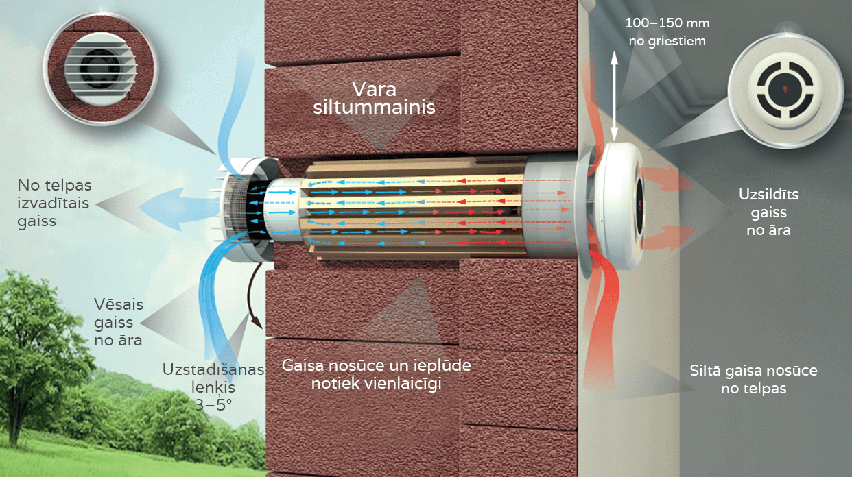 To install the heat recovery unit, you need to make a small hole in the wall, insert the unit and connect the electricity supply.